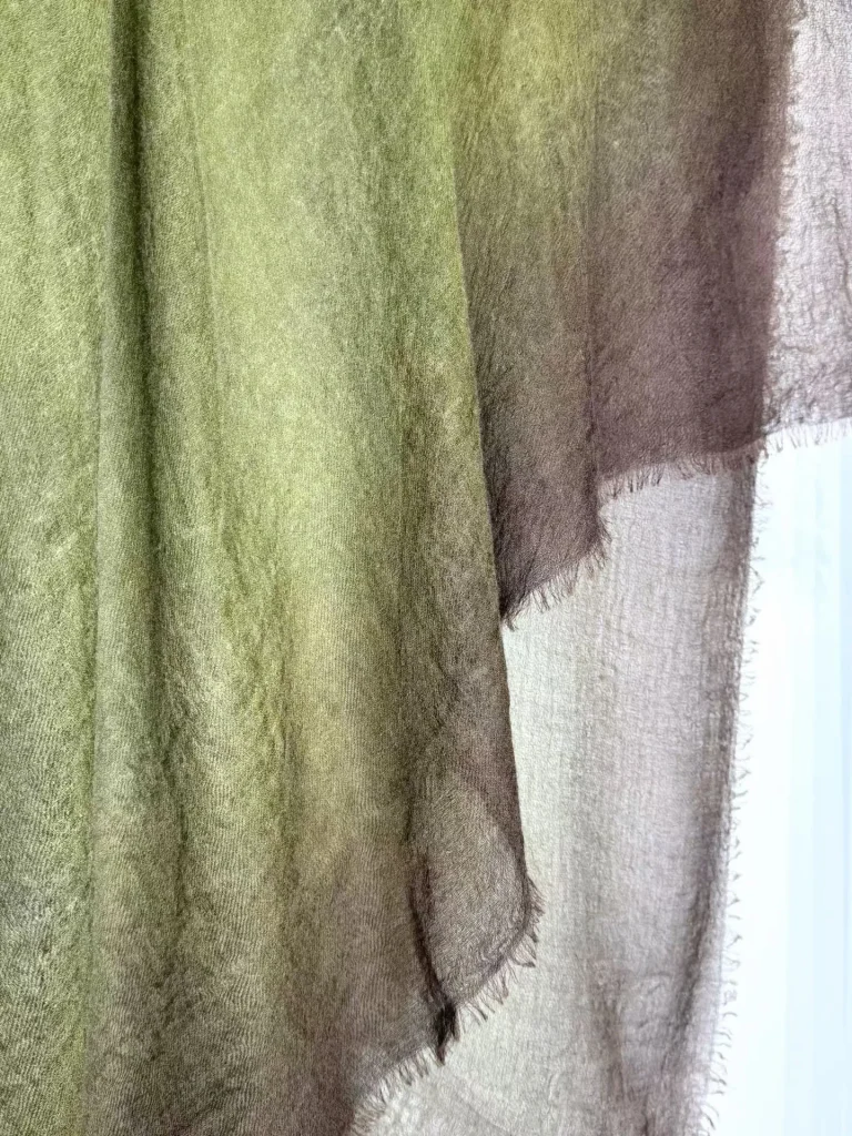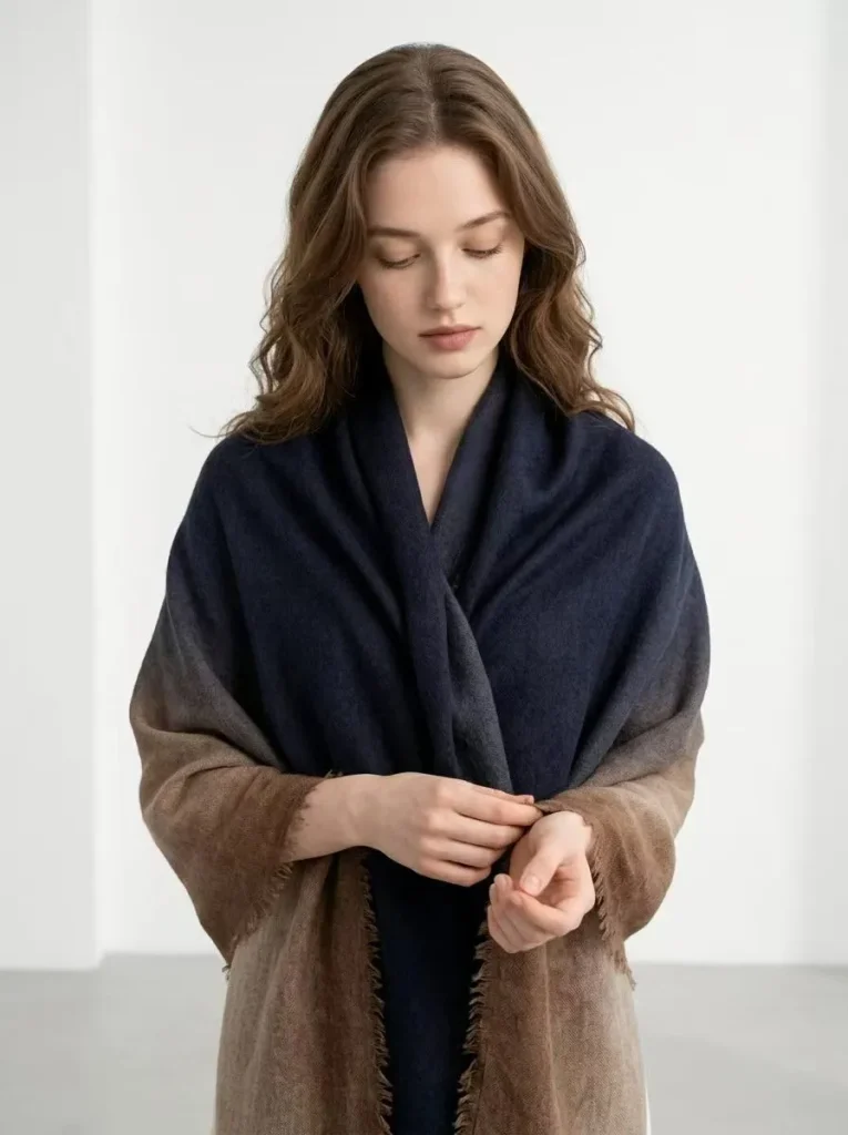 Основным материалом этой коллекции служит кашемир премиум-класса из пуха горных коз. Его волокна отличаются невероятной тонкостью и мягкостью: они дарят ощущение прикосновения облака, нежно лаская кожу, и при этом обладают удивительной способностью сохранять тепло, несмотря на свою невесомость. В отличие от традиционных тяжелых шалей, эти изделия тщательно сотканы с применением техники «Ring Cashmere» (кашемир «кольцо»), что обеспечивает им не только изящную драпировку, но и высокую прочность. При ношении они ложатся на плечи совершенно свободно — без ощущения тяжести или громоздкого объема — полностью оправдывая звание универсального аксессуара для любого сезона. Они с легкостью адаптируются к свежему воздуху ранней весны, прохладе кондиционируемых летних помещений, ласковому ветерку осенних вечеров и требованиям многослойного зимнего гардероба.