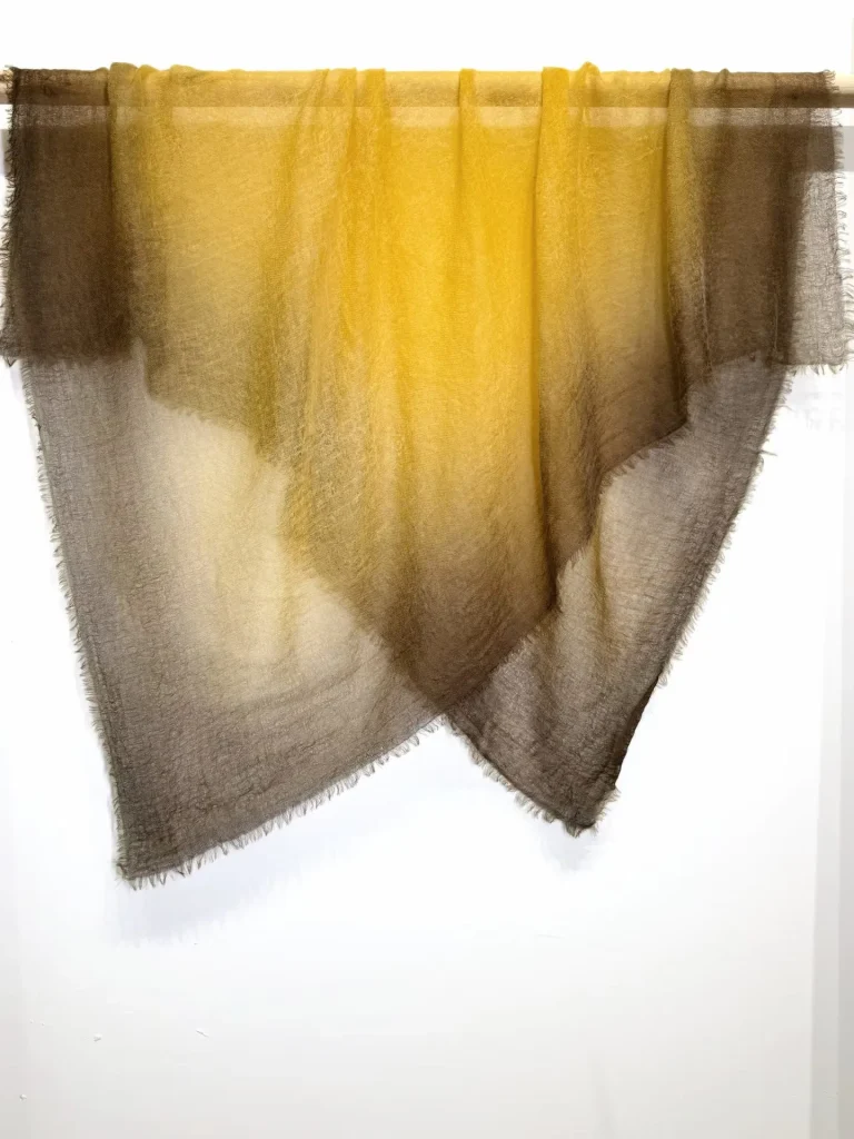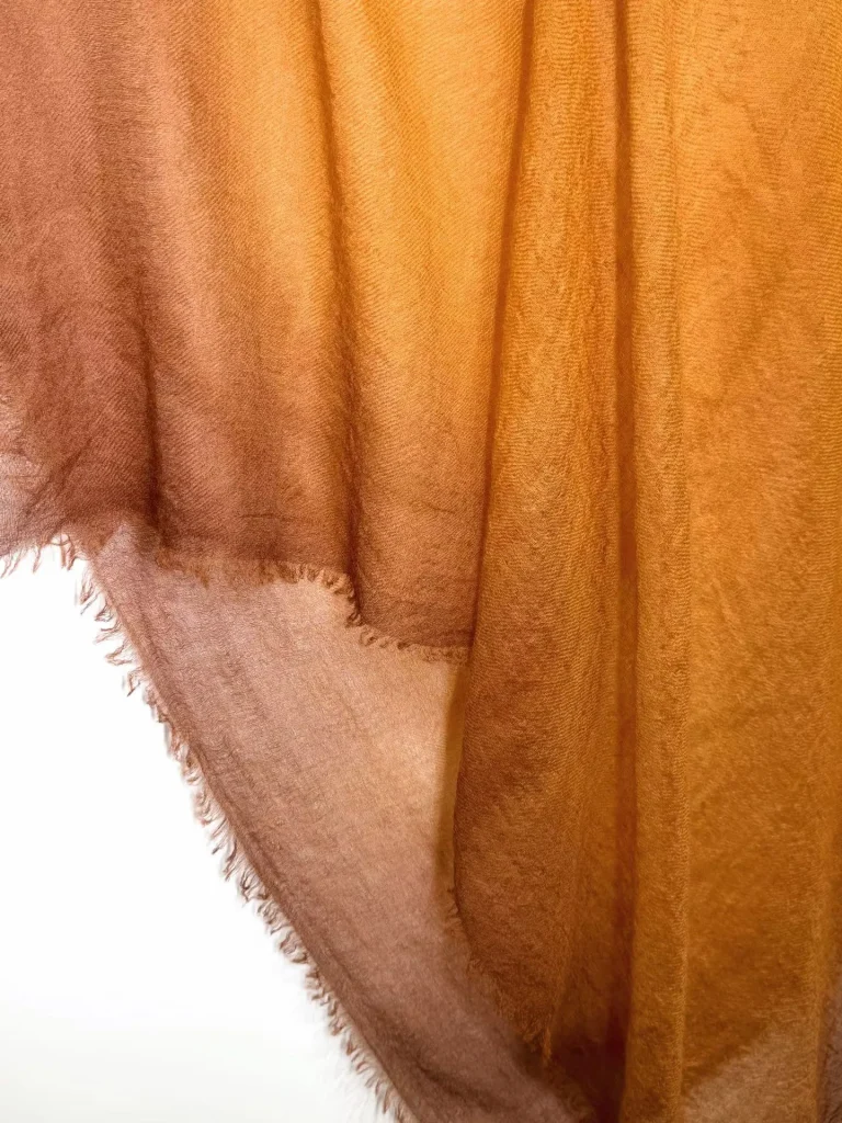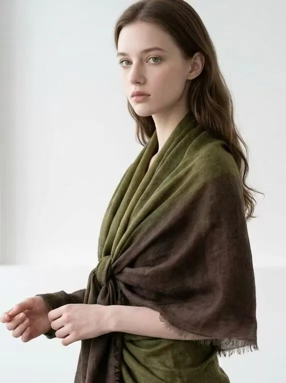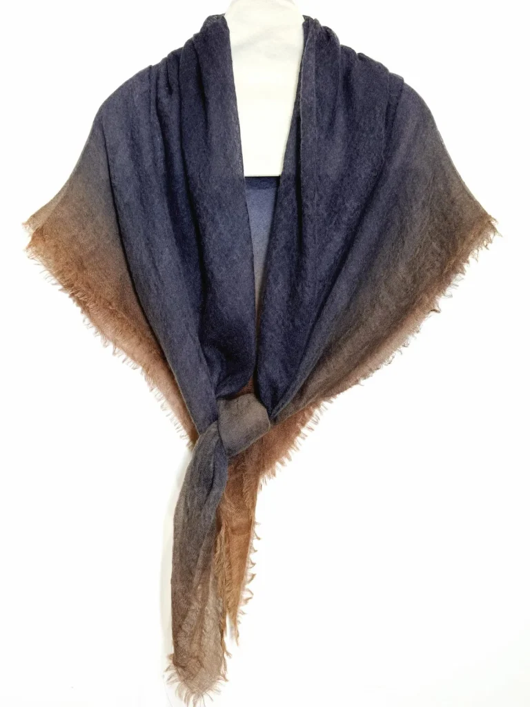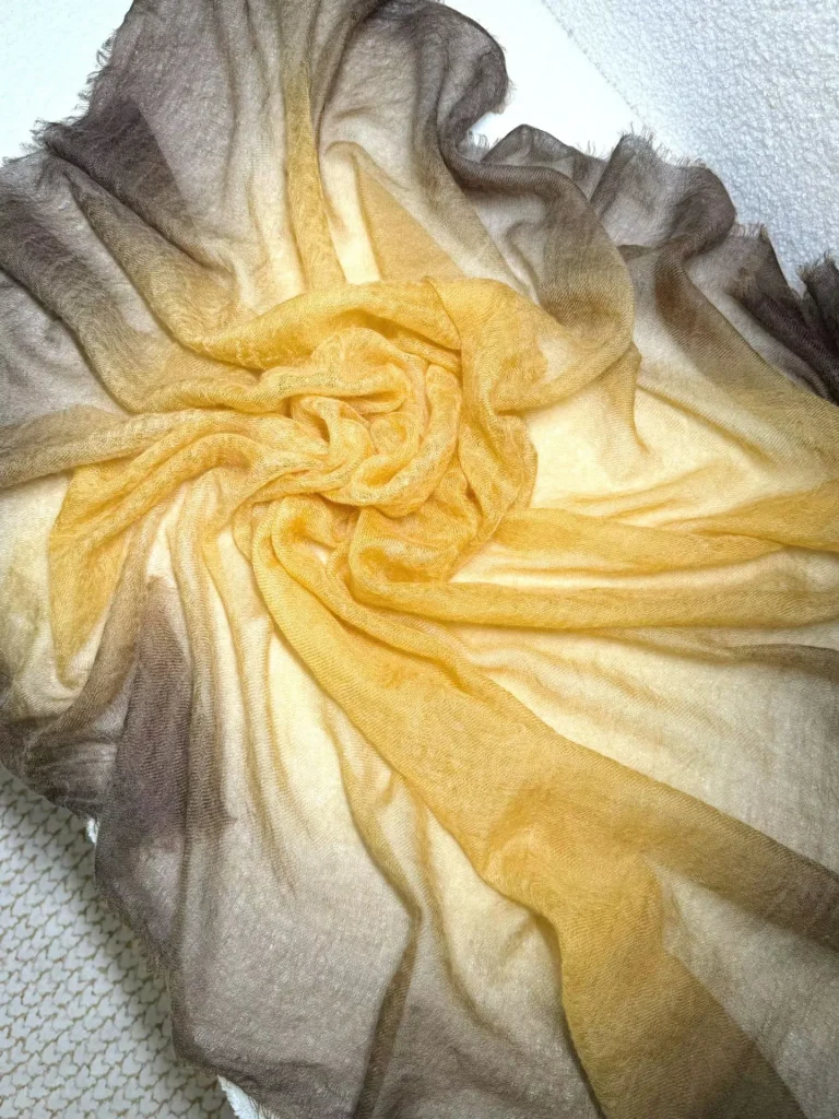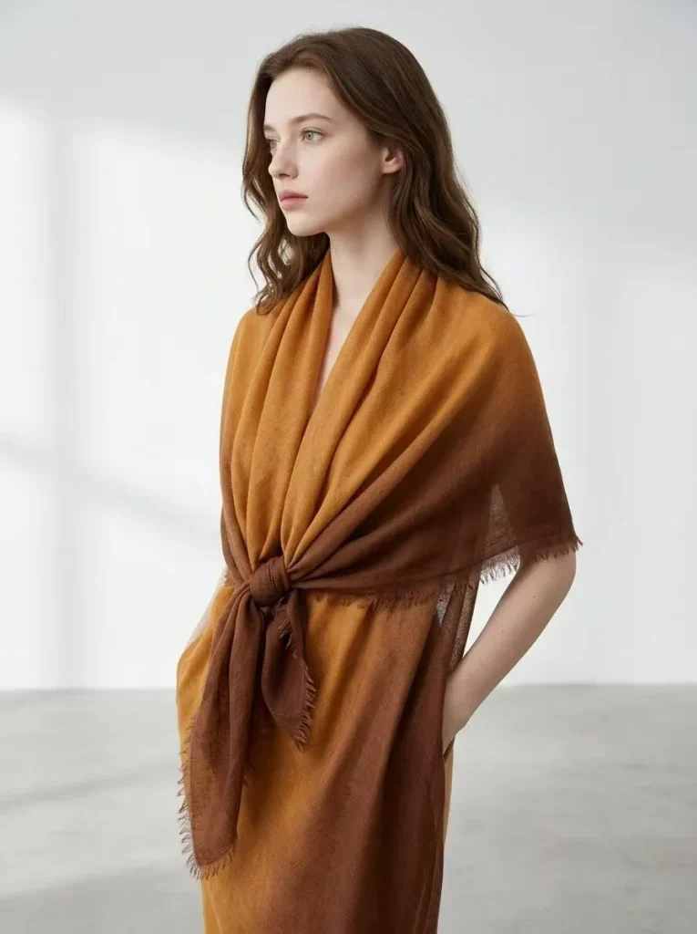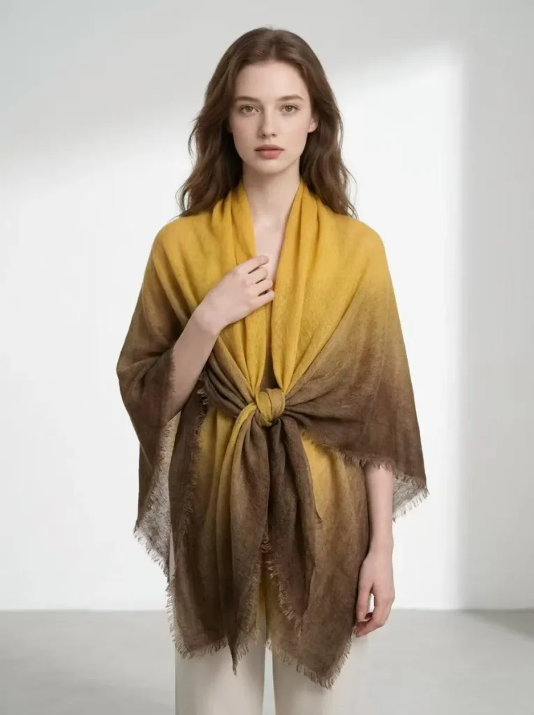 Естественный переход от теплого золотистого к глубокому коричневому оттенку служит самой узнаваемой визуальной визитной карточкой этой коллекции. Авторская техника градиентного окрашивания позволяет цветам распускаться на ткани мягкими, многослойными переливами — словно теплое осеннее солнце, разливающееся по плечам. Эта эстетика воплощает в себе спокойную умиротворенность и универсальность природных «земляных» тонов, одновременно подчеркивая глубину и объемность за счет игры света и тени. Нежная фактура кашемира «Ring Cashmere» ручной работы великолепно гармонирует с этими градиентными оттенками; будь то в сочетании с простым трикотажным свитером или в качестве акцента к строгому классическому костюму — эта шаль мгновенно преображает образ, наполняя его ощущением утонченной роскоши и атмосферным шармом. **Универсальный стиль: одна вещь — бесконечные возможности**